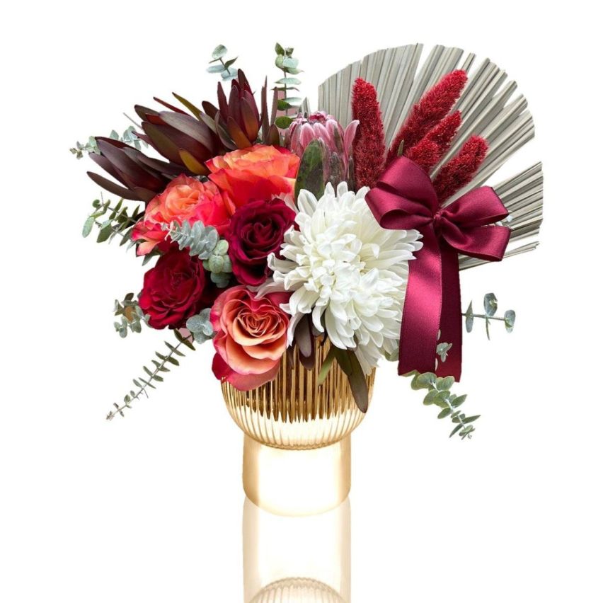 Amber Tonlarının Yoğun olduğu elegant çiçek aranjmanı...İçerisinde bulunan turuncu ve kırmızı güllerin beyaz anastasia çiçeği ve şoklanmış kuru çiçekler ile uyumu