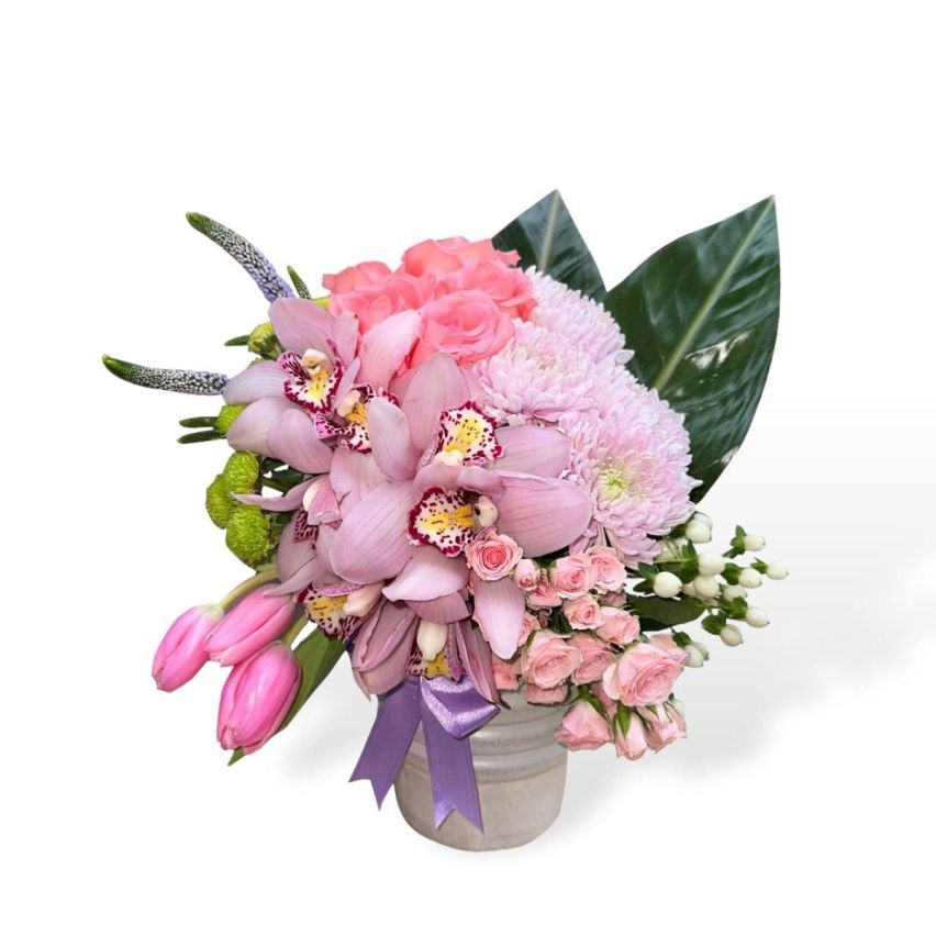 Deluxe Paşabahçe vazo içerisinde, Pembe spidyum orkide, ithal Lila / Pembe güller ve beyaz çiçekler ile tasarlanmış şık ve zarif aranjmanımız ile ona, kendisini adete bir çiçek bahçesinde hissettireceksiniz.