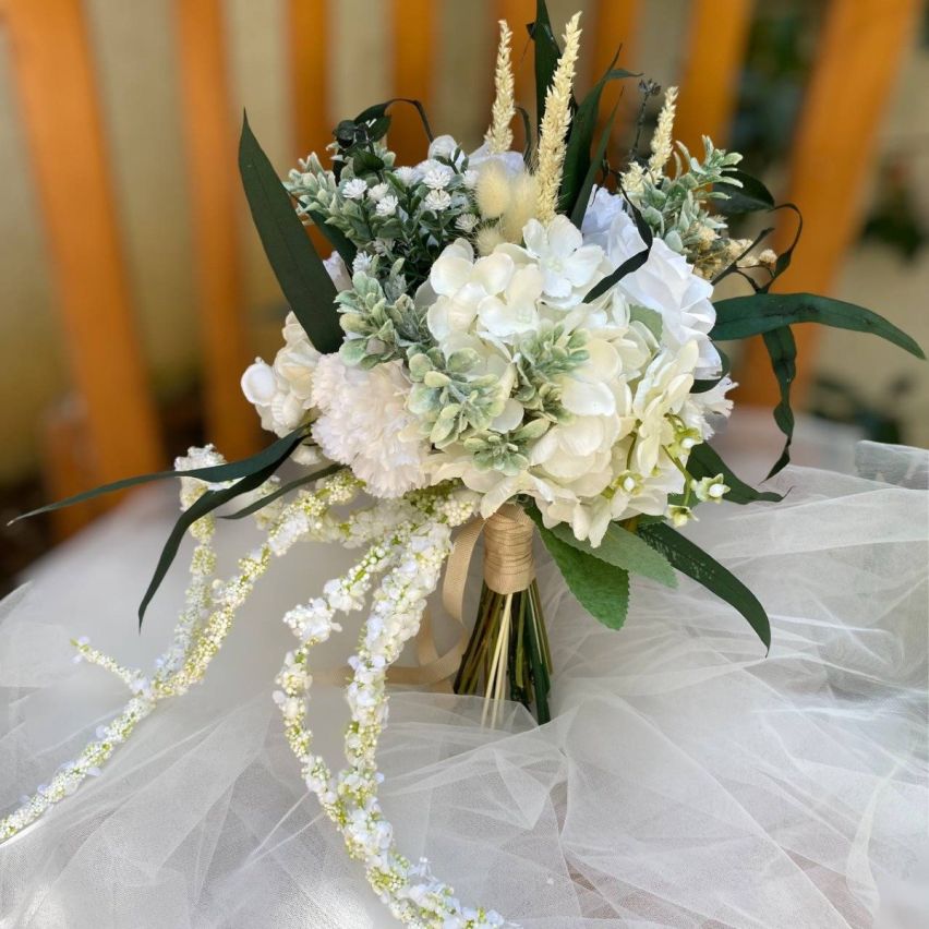 Beyaz çiçeklerin temizliği ve yeşilliklerin doğal cazibesiyle, özel gününüzde göz alıcı bir görüntü oluşturun.