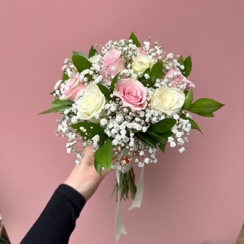 Pembe ve beyaz ithal güllerden oluşan gelin buketimiz