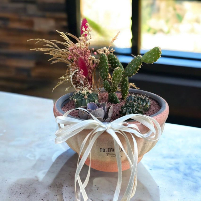 Lüks saksıda çeşitli kaktüs, sukulent ve kuru bitki aranjmanı.