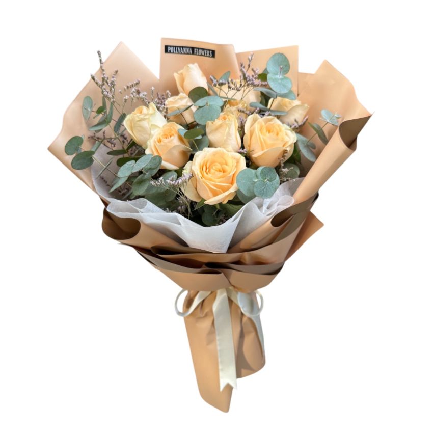 Buket içerisinde 9 adet somon renkli güller ve yeşillikler bulunmaktadır