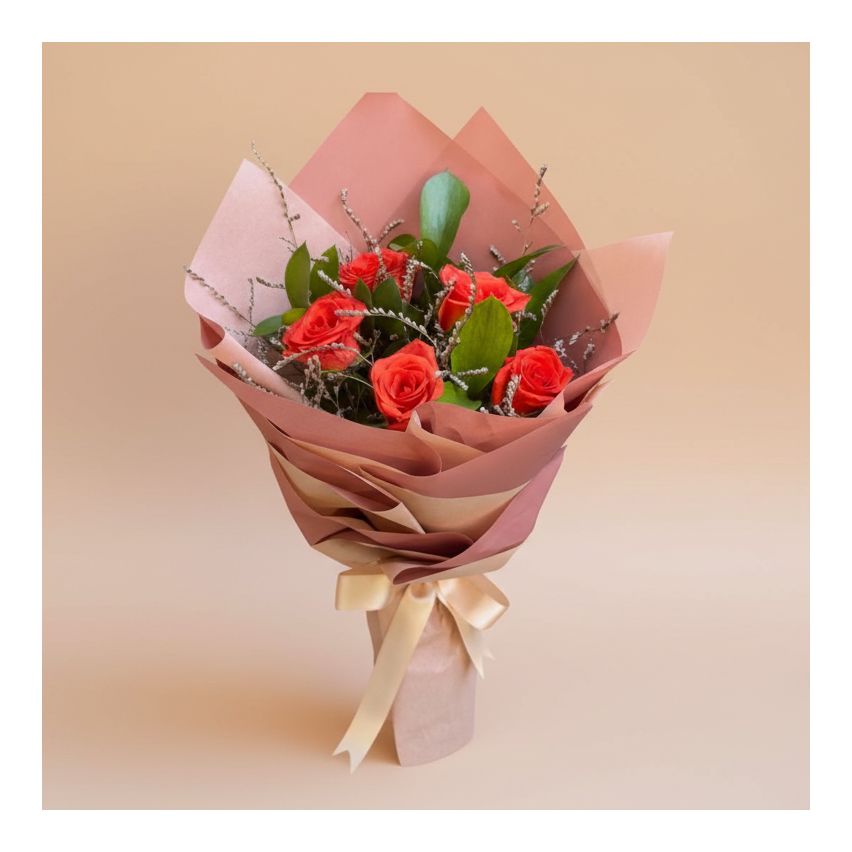 Buket içerisinde 5 adet ithal turuncu ekvator gülleri ve yeşil garniturler bulunmaktadır. Midi boy bir bukettir.